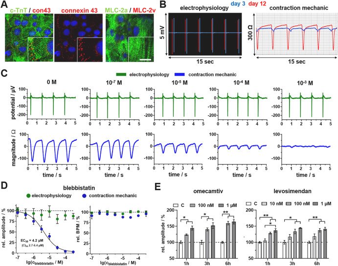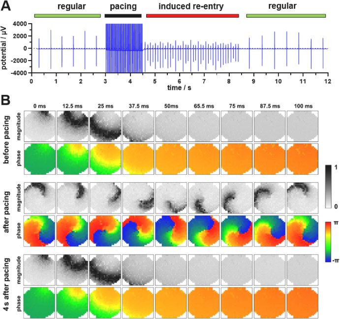 In recent decades, significant progress has been made in the treatment of heart diseases, particularly in the field of personalized medicine. Despite the development of genetic tests, phenotyping and risk stratification are performed based on clinical findings and invasive in vivo techniques, such as stimulation conduction mapping techniques and programmed ventricular pacing. Consequently, label-free non-invasive in vitro functional analysis systems are urgently needed for more accurate and effective in vitro risk stratification, model-based therapy planning, and clinical safety profile evaluation of drugs. To overcome these limitations, a novel multilayer high-density microelectrode array (HD-MEA), with an optimized configuration of 512 sensing and 4 pacing electrodes on a sensor area of 100 mm2, was developed for the bioelectronic detection of re-entry arrhythmia patterns. Together with a co-developed front-end, we monitored label-free and in parallel cardiac electrophysiology based on field potential monitoring and mechanical contraction using impedance spectroscopy at the same microelectrode. In proof of principle experiments, human induced pluripotent stem cell (hiPS)-derived cardiomyocytes were cultured on HD-MEAs and used to demonstrate the sensitive quantification of contraction strength modulation by cardioactive drugs such as blebbistatin (IC50 = 4.2 μM), omecamtiv and levosimendan. Strikingly, arrhythmia-typical rotor patterns (re-entry) can be induced by optimized electrical stimulation sequences and detected with high spatial resolution. Therefore, we provide a novel cardiac re-entry analysis system as a promising reference point for diagnostic approaches based on in vitro assays using patient-specific hiPS-derived cardiomyocytes.